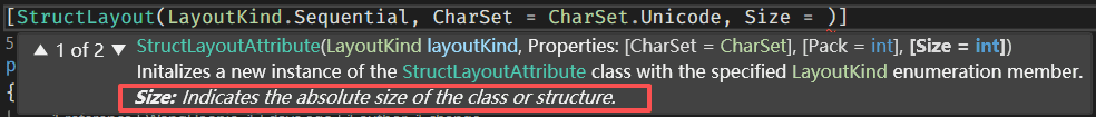 想必你已经突然意识到这个 Size 是干什么的了,也就是指定该结构的绝对大小,不受操作系统、字符集等的影响。有了这个,CLR 就会用我们定义的大小,而不是帮我们计算。