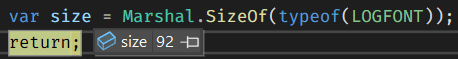 那 LOGFONT 的大小怎么获取呢?我们可以调用一下 Marshal.SizeOf 方法 (先别删除所有字段):
